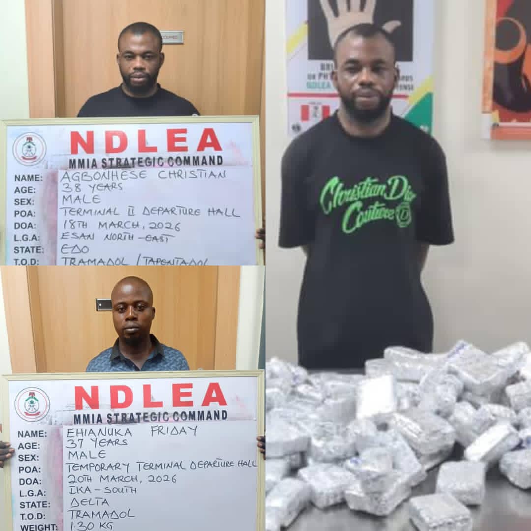 Two of the consignments heading to Italy were to be moved through the Lagos airport where two suspects linked to the shipments were promptly arrested. One of them, 37-year-old Friday Ehianuka was going to Rome, Italy on Friday 20th March 2026 when he was intercepted while attempting to board an Ethiopian Airlines flight with 2,698 pills of tramadol 225mg concealed in containers of skin light body cream, all packed in the suspect’s luggage.