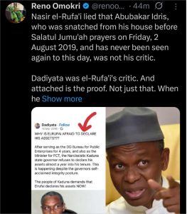 The missing activist Abubakar Idris, also known as Dadiyata, was a critic of the former Kaduna State governor, according to former presidential advisor Reno Omokri, who has refuted assertions made by the former governor.